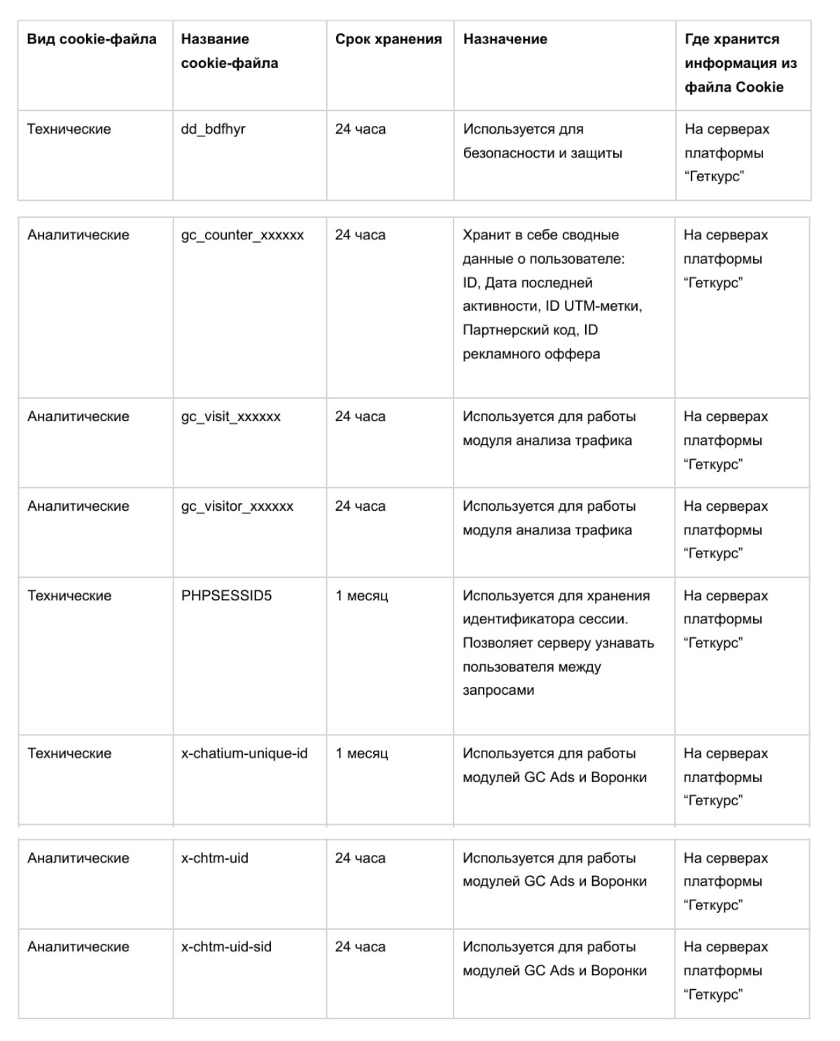 Cookie-файлы устанавливаются Платформой «Геткурс» согласно информации, указанной в таблице: